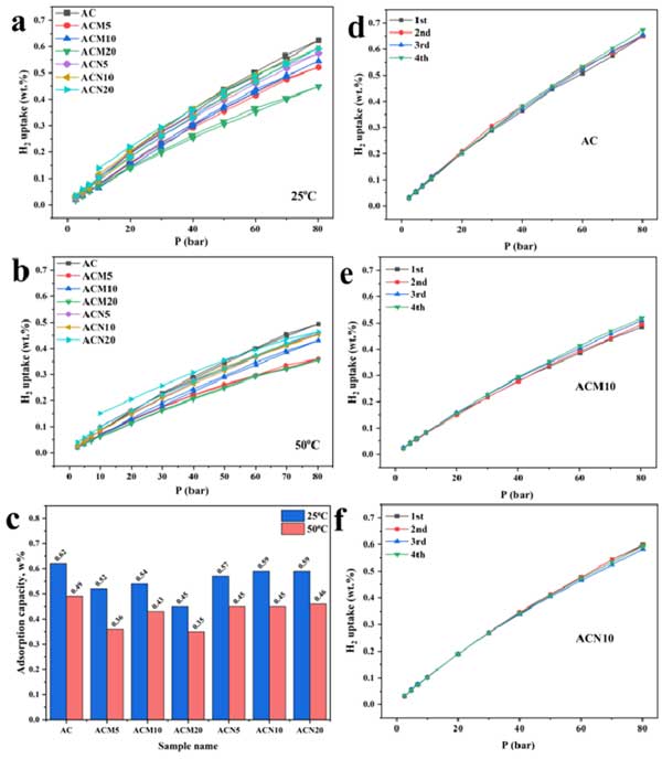 氫氣儲存材料在實際應用中需要具備良好的循環(huán)性能。作者對AC、ACM10、ACN10等樣本進行了若干次(例如10次或更多)吸附–解吸循環(huán)測試,以評估其穩(wěn)定性。原文圖2d、5e、5f展示了循環(huán)曲線。