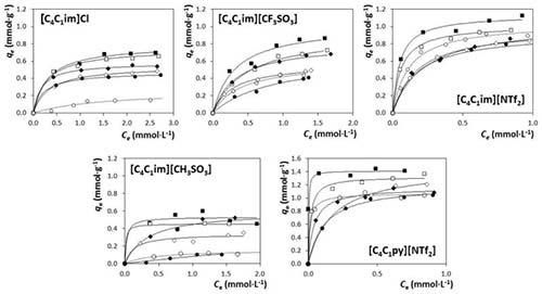 得到的結(jié)果表明,活性炭的不同的吸附能力與IL的性質(zhì)和溶液中的鹽量有關(guān)。一般而言,對于咪唑鎓的ILs,陰離子對其對活性炭的吸附能力的影響按照以下順序:Cl - ≈[CH 3 SO] <[CF 3 SO 3 ] -<[NTf 2 ] 。這一趨勢的結(jié)果和預(yù)計的相符合,并且表明,隨著陰離子疏水性的增加,活性炭對ILs的吸附逐漸增加。另一方面,考慮到IL陽離子家族,活性炭能吸附更多的吡啶鎓比基于咪唑類的對應(yīng)物?傊@里證明,如果伴隨使用無機鹽來促進鹽析現(xiàn)象并增強隔離度,則活性炭也可以用作水介質(zhì)中低濃度存在的親水性IL的有效吸附劑。得到的結(jié)果表明, 在鹽的存在下,親水性ILs的例如[C 4 C 1 im] Cl和[C 4 C 1 im] [CH 3 SO3 ]的K d值增加高達5.5倍。這種新方法可以被設(shè)想為減少由使用IL的工業(yè)過程產(chǎn)生的含水物流污染的有希望的途徑。
