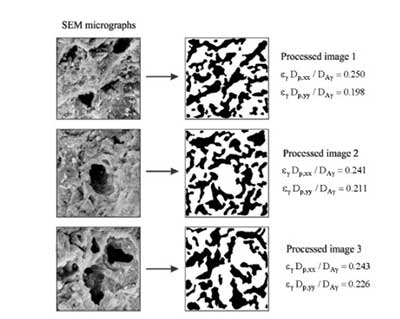 通過(guò)掃描電子顯微鏡使用2400倍放大倍數(shù)檢查活性炭的形態(tài)。使用圖像處理工具箱處理圖像。程序如下。首先,通過(guò)將灰度轉(zhuǎn)換為灰度(從0(黑色)到255(白色)]來(lái)改善黑暗和光照區(qū)域之間的對(duì)比度。由于深色區(qū)域在視覺上指示深刻,所以假設(shè)這些代表孔隙占據(jù)的部分,而淺色區(qū)域與固體基質(zhì)(活性炭)有關(guān)。這個(gè)想法一點(diǎn),每個(gè)象素的灰度值被跟蹤(來(lái)自黑色),并累積,得到體積分?jǐn)?shù) ε γ 的較暗的像素。其次,具有等于或小于閾值的值的所有像素被轉(zhuǎn)換成白色(被孔占據(jù)的空間),而具有較高值的像素被轉(zhuǎn)換成黑色(實(shí)心矩陣)。最后,為了增強(qiáng)輪廓的定義,應(yīng)用濾波器。這個(gè)程序允許我們獲得最終的二值圖像,其中白色和總像素?cái)?shù)之間的比率等于活性炭的孔隙率。事實(shí)上,來(lái)自SEM顯微照片的處理圖像提供了解決閉合問(wèn)題的領(lǐng)域。