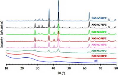 由活性炭和活性炭負(fù)載的鎳在不同的熱處理溫度下記錄的X射線衍射圖如圖1 所示。在200中被加熱的樣品 ℃,在2θ顯示有2個衍射峰 = 23.5和43.5°,對應(yīng)于(0 0 2),(1 0 無定形活性炭0)指數(shù)平面。另外,隨著煅燒溫度從300 ℃ 升高到800 ℃ ,反射次數(shù)增加,表明添加的催化劑在2θ = 37.1°,43.2°,62.7°和75.3° 處被氧化成氧化鎳 。這些角度分配給(1 1 1),(2 0 0),(2 2 0)和(3 1 1)面,立方晶體的氧化鎳。此外,對于400-800 ℃ 煅燒的樣品,在對應(yīng)于(2 2 2)的2θ = 79.3° 處觀察到新的峰。氧化鎳峰的強(qiáng)度也隨著煅燒溫度的增加而增加。