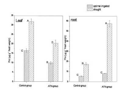 當(dāng)葉片中的游離脯氨酸含量降低時(shí),表明當(dāng)存在活性炭混合物時(shí),干旱條件下植物的生理損傷水平降低。這種影響可能是由于天然硅鋁酸鹽存在的濕度增加。盡管干旱條件誘導(dǎo)了對照組和活性炭混合物組的根中游離脯氨酸含量的顯著增加,但活性炭組中這種增加更為顯著;钚蕴炕旌衔锝M植物根中游離脯氨酸含量極高,增加了脯氨酸的保護(hù)作用,脯氨酸在植物組織中起到滲透物質(zhì)的作用:使植物更有效地吸收干旱土壤中的水分。