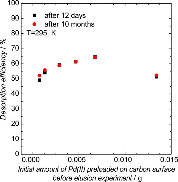在活性炭表面存在二氯化鈀的情況下,應該可以根據(jù)方程解吸它。因此,解吸試驗在室溫(20℃)進行,使用100厘米3鹽酸(濃度為1mol·kg-1)或100厘米3的高氯酸鹽酸(濃度1mol.kg-1)。必須提及的是,吸附實驗在pH等于1下進行,而汽提過程在pH等于0下進行。由鈀(II)負載的活性炭樣品取自先前的吸附實驗。通過過濾將預加載的活性炭與溶液分離,然后在60℃下干燥。接著,將干燥的預加載的活性炭與鹽酸溶液混合。解吸試驗進行約10個月。在前2天,觀察到溶液中鈀(II)濃度的快速增加,最終在12天后獲得恒定值。這些結(jié)果如圖4所示作為黑色方塊。為了確保這確實是最終的平衡,樣品在接下來的10個月內(nèi)留在溶液中。在此時間之后獲得的值顯示為紅點。過量的鹽酸是顯著的,它應該足以溶解二氯化鈀。結(jié)果表明,平衡狀態(tài)不受時間影響,表明觀察到的狀態(tài)是最終狀態(tài)。似乎在該實驗期間,只有約50-65%的鈀(II)物質(zhì)可以從活性炭表面洗脫。如上所述,施加過量的鹽酸。因此,一方面,不完全洗脫可以通過Pd2 OCl2的形成來解釋或活性炭表面上的另一種鈀(II)化合物。另一方面,它可能僅僅與出現(xiàn)與初始狀態(tài)不同的新平衡狀態(tài)有關(guān)。為了切斷推測,進行簡單的第二次解吸試驗,其中使用來自第一次解吸試驗的活性炭。實驗條件和程序與第一次解吸試驗期間的相同。觀察到鈀(II)的洗脫再次發(fā)生。在最初的24小時后,高達17%的剩余鈀(II)被解吸,而在2個月后,總解吸效率達到98.4%的水平。