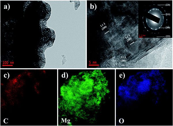 圖2、(a)TEM和(b)改性活性炭氧化鎂含量10%樣品的HR-TEM圖像,(b)的插圖是相應(yīng)的SAED圖案。(c-e)改性活性炭氧化鎂含量10%樣品,鎂和氧的EDS映射元素。