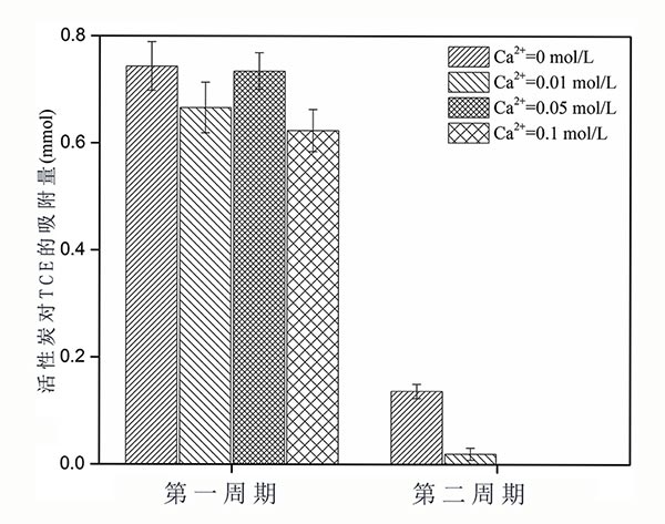 如圖2所示,進行了兩次吸附/再生循環(huán)。在第一次吸附/再生循環(huán)期間,當鈣離子存在時,TCE去除明顯減少。顯然,在第二次吸附/再生循環(huán)期間,即使進行活性炭的再生,也難以在鈣離子條件下除去TCE。這表明鈣離子不僅在活性炭的吸附能力,而且在其再生過程中都起著重要作用。原因可能是由于鈣離子與其他離子的結(jié)合,導致其容易在活性炭表面上沉淀并影響其吸附能力,導致第二循環(huán)中TCE去除的減少。