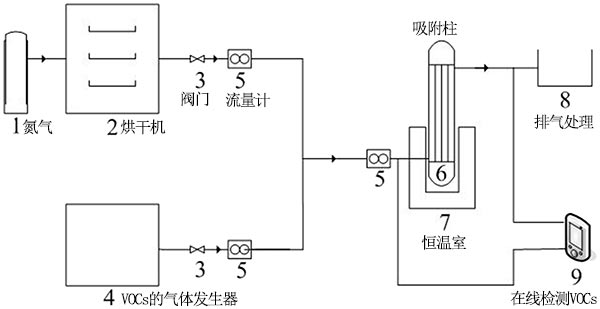 在吸附柱中研究了活性炭吸附甲苯的能力;钚蕴康挠昧繛10g,吸附質(zhì)甲苯氣體由氣體發(fā)生器產(chǎn)生。通過(guò)測(cè)定吸附前后甲苯的濃度,得到了不同條件下活性炭吸附性能的數(shù)據(jù)。實(shí)驗(yàn)吸附裝置的流程圖如圖2所示。將來(lái)自氣體發(fā)生器的甲苯氣體與氮?dú)饣旌,然后將其吸附在恒溫吸附塔中。通過(guò)在線FID檢測(cè)器測(cè)量吸附前后的甲苯含量,并通過(guò)流量計(jì)控制甲苯流量。當(dāng)脫氣和入口濃度在30分鐘內(nèi)保持一致時(shí),認(rèn)為已達(dá)到吸附平衡。吸附氣體通過(guò)廢氣出口排空。