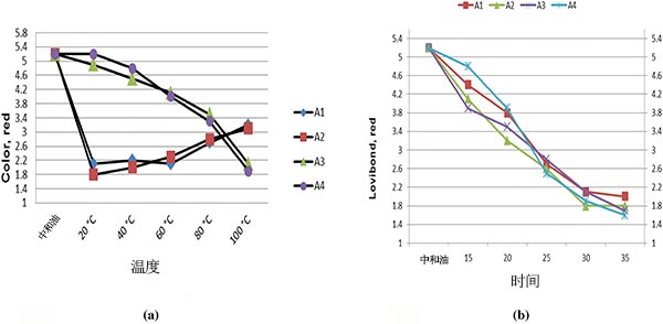 圖2:(a)溫度和時間(b)對漂白過程的影響。