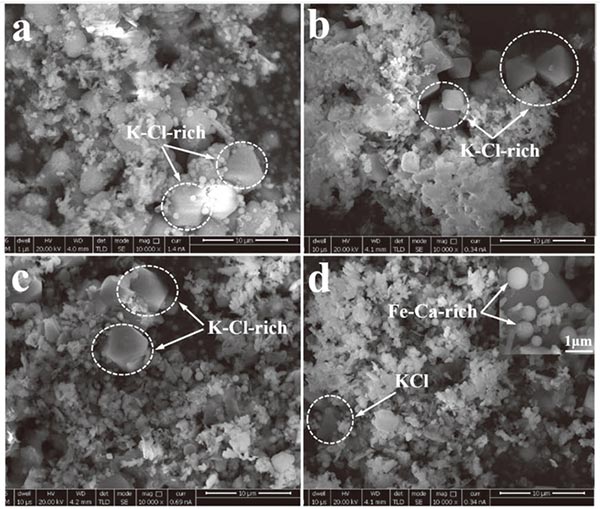 圖4顯示了煙氣通過活性炭之前和之后的化學(xué)組成。可以發(fā)現(xiàn)PM 2.5中的+ Fe,Ca,Si,Al和Mg的含量在煙氣通過活性床時(shí)比基礎(chǔ)情況下都有所增加,而K,Na,Pb的含量, PM 2.5中的 Zn和Cl都出現(xiàn)了下降。圖5給出了煙氣經(jīng)過活性炭層后在過濾器中收集的PM 2.5的SEM圖像,觀察到經(jīng)活性炭去除后,較大顆粒的數(shù)量主要由K和Cl組成減少(圖5)(b)-5(d))與基本情況比較(圖5(a))雖然有許多較小的顆粒,如球形顆粒(圖5(d)),主要包含F(xiàn)e和Ca這種現(xiàn)象與PM 2.5的化學(xué)成分變化非常一致。此外,與使用厚度為200毫米,粒度為8-12毫米的活性炭床的情況相比(圖5(b)),出現(xiàn)了較少的大的富含K-Cl的顆粒,并且出現(xiàn)了許多較小的球形富含F(xiàn)e-Ca的顆粒。