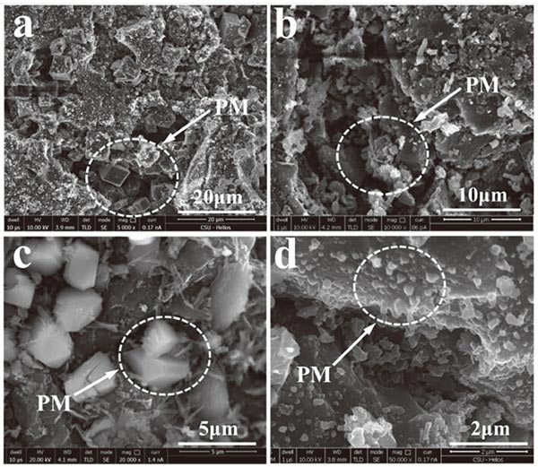 圖5顯示了粘附顆粒物質(zhì)后活性炭的形態(tài),其中可以發(fā)現(xiàn)許多顆粒分布在活性炭的孔隙或表面上。圖5(a)-5(c)中示出了分布在孔隙尺寸約20顆粒 μ米,5-10 μm和1 μ米。圖5(d)示出了分布式活性炭的表面上的顆粒,其直徑幾乎小于1 μ微米。圖6給出了分布在孔隙中的顆粒的SEM映射,表明大量顆粒富含K,并且它們主要以氯化物或硫酸鹽的形式存在。這些顆粒的出現(xiàn)對(duì)應(yīng)于PM 2.5中K和Cl含量的降低。