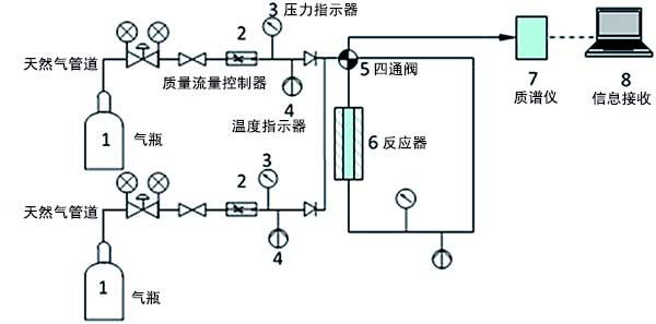 在我們之前的工作中開發(fā)了吸附裝置來測量氣體穿透曲線(圖1)。它由三個主要部分組成:準備部分、吸附段和分析部分。在氣體制備部分中,吹掃氣體是高純度Ar氣體(99.999%),其用于在引入烴氣體之前通過惰性氣體管線和反應(yīng)器吹掃系統(tǒng)。吸附部分使用丙烷或乙烷在氦氣或人造氣體混合物,其通過燃料氣體管線和反應(yīng)器。這兩條線都碰到了一個四端口交叉閥。整個裝置等溫(~26℃)。閥門位置,氣體流量,壓力和溫度完全自動化,并由內(nèi)部程序控制。通過質(zhì)譜儀分析和量化來自反應(yīng)器出口的氣體。