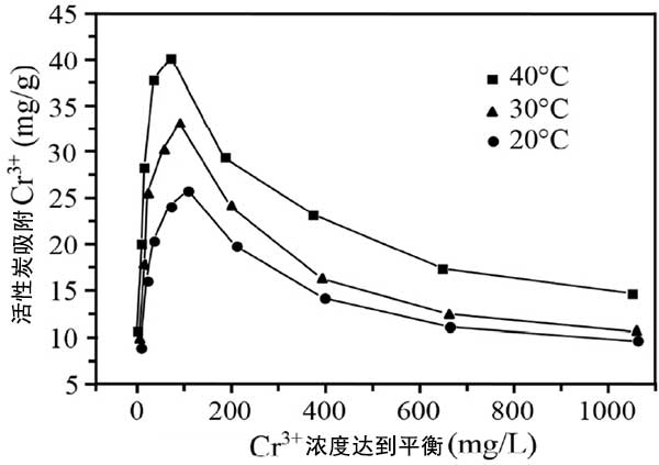 2、已經(jīng)確定,活性炭在20、30和40℃下的鉻吸附等溫線具有取決于平衡濃度的不規(guī)則形狀。三條曲線顯示出類似的趨勢,陽離子攝取量的初始增加非?。達到最大值后,隨著平衡溶液中鞣劑含量的增加,它們明顯降低。