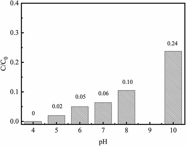 初始pH對鉻酸鹽去除能力的影響如圖3所示。發(fā)現(xiàn)鉻酸鹽的去除能力明顯受pH值在4.0-10.0范圍內(nèi)的影響。隨著溶液pH從4增加到10,鉻酸鹽去除率從100%下降到76%。在pH~4.0時,HCrO 4是鉻酸鹽的主要形式。因此,在高溶液的pH值,使Cr之間的強烈競爭羥基(OH)應(yīng)該是低鉻酸鹽去除能力的主要原因。此外,較低的pH可有助于去除無源氧化鐵層,活性炭復(fù)合材料的表面中含有納米零價鐵用于接觸周圍的Cr(vi)溶液。因此,在所有后續(xù)的程序?qū)r溶液的初始pH設(shè)定為4.0。