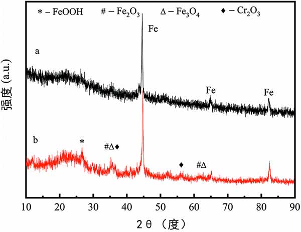 在該研究中,應(yīng)用XRD分析鉻酸鹽溶液處理后的活性炭以揭示其機制。在與鉻酸鹽溶液反應(yīng)2小時后,活性炭的XRD圖譜沒有顯著改變(圖4)。然而,與新制備的活性炭相比,可以清楚地檢測到氧化鐵晶相。XRD結(jié)果表明,而在去除鉻酸鹽期間,活性炭搭載的納米零價鐵可以被氧化成Fe(ii)和Fe(iii)化合物。