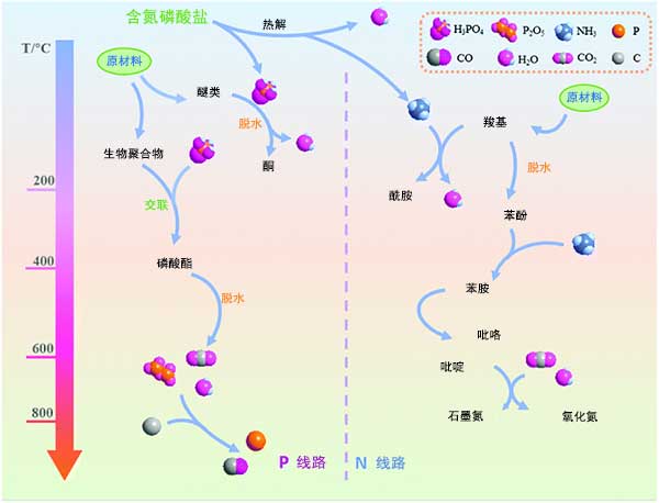 圖1:熱解過程中活性炭原料和含氮磷酸鹽之間可能的反應(yīng)。