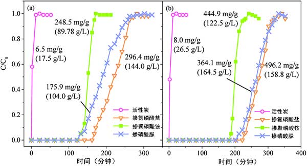 活性炭對(duì)甲苯的穿透曲線以及吸附容量如圖2所示。沒摻氮的活性炭表現(xiàn)出較差的甲苯吸附性能,吸附容量分別為6.5和8.0mg g-1。與摻氮活性炭相比,添加含氮磷酸鹽的活性炭需要更長(zhǎng)的時(shí)間才能接近突破并表現(xiàn)出更高的吸附能力。對(duì)于在600℃下制備的活性炭,其經(jīng)含氮磷酸鹽處理的活性炭的突破時(shí)間為氨磷酸鹽活性炭>磷酸脲活性炭>聚磷酸銨活性炭,其相應(yīng)的體積吸附容量為144.0,104.0和89.8g L-1,質(zhì)量吸附容量分別為296.4,175.9和245.8 mg g-1,分別。與600℃相比,900℃制備的活性炭具有更高的甲苯吸收量,體積吸附容量為122.5-164.5g L -1,質(zhì)量吸附容量為364.1~496.2 mg g-1。值得注意的是,可以看出氨磷酸鹽處理的活性炭具有較高的質(zhì)量吸附能力,而磷酸脲處理的活性炭具有較高的體積吸附能力。這可能歸因于它們不同的堆積密度,氨磷酸鹽具有比磷酸脲更高的堆積密度。