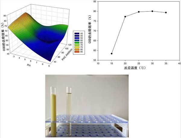 在絮凝實驗中,pH值,絮凝劑添加量和反應溫度是影響COD去除率的主要因素。為了確定切削液廢物處理影響的因素和相互作用,進行了響應面分析。不同活性炭濃度和改變pH和反應溫度對COD去除速率的影響的響應面分別如圖2a,b所示。絮凝前后切削液水樣的比較如圖2c所示。