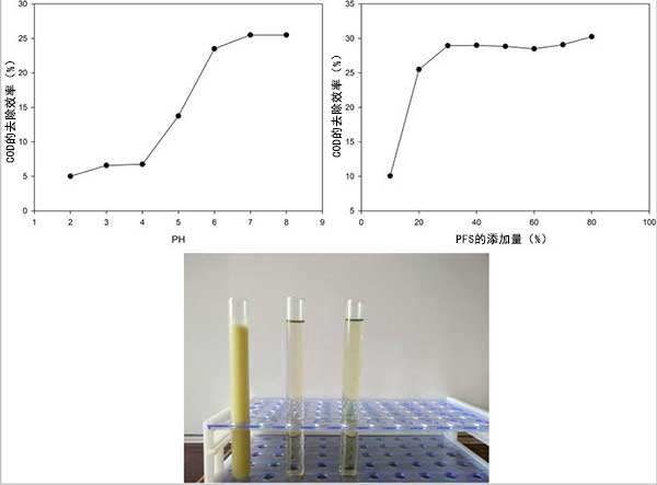 在活性炭負載鐵離子的初級絮凝預處理后,濾液含有少量雜質(zhì)。研究了PFS絮凝劑對過濾廢物的影響。使用單因素實驗選擇pH值和PFS添加量(圖3a,b)。原始溶液與初級和次級絮凝后的溶液的視覺比較顯示在圖3c中。