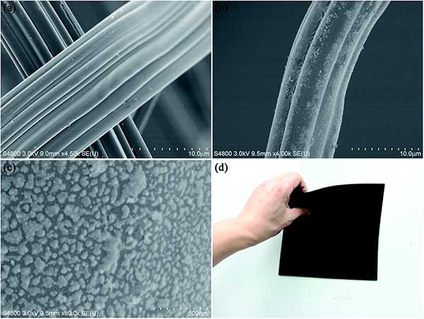 圖2:活性炭復(fù)合材料纖維的SEM和實(shí)物圖。