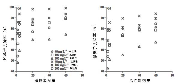 對于吸附實驗,僅研究用3.0wt%KMnO 4熱解和改性的活性炭,能對于水處理足夠穩(wěn)定并且以較小的熱解溫度生產(chǎn)。因此,選擇該樣品用于線束移除實驗。值得注意的是,熱解的未改性活性炭在水硬度溶液中相當(dāng)不溶。這表明熱解的未改性活性炭的表面是非常疏水的。在活性炭對Ca 2+和Mg 2+離子的吸附效率中可以看出,Ca2+的吸附效率和Mg 2+離子增加了與具有相同硬度濃度的溶液增加吸附劑用量,并用硬度濃度的增加而降低對于相同的吸附劑劑量(圖2)。然而,吸附容量隨著初始硬度濃度的增加而增加。此外,可以看出Ca 2+和Mg 2+離子對用3.0 wt%KMnO 4改性的活性炭吸附效率與在相同劑量和硬度濃度下熱解的未改活性炭觀察到的值相比,改性的活性炭更高。此外,對于相同的劑量和硬度濃度,Ca 2+離子(圖2a)與Mg 2+離子(圖2b)相比顯示出更高的吸附效率,這表明活性炭對Ca 2+離子的選擇性更高。