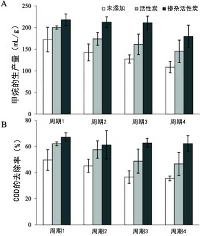 圖2:(A)四個連續(xù)活性炭補(bǔ)料分批循環(huán)中的平均特定甲烷產(chǎn)量和(B)COD去除效率。