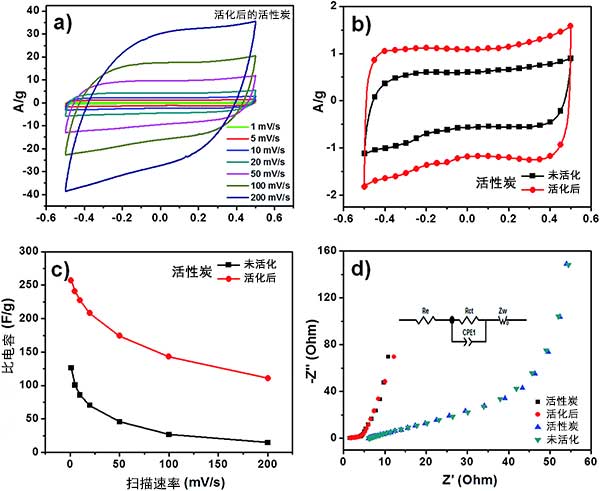 在不同掃描速率下觀察到兩種活性炭的準矩形CV曲線(圖3a),這暗示了非理想的電容行為。我們還觀察到活化后的活性炭的CV環(huán)路較大,這意味著它具有比未活化的活性炭更大的電容(圖3b)。具體電容的總結如圖3c所示,活化后活性炭獲得的高電容為270,而沒活化的活性炭為125。這種高電容可歸因于諸如高表面積,分級孔徑分布和活性炭的表面潤濕性等因素。對于兩種活性炭,由于電解質不足以擴散到電極材料的內孔中而觀察到對應于掃描速率增加的比電容的降低。