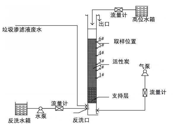 活性炭反應(yīng)器工藝流程圖如圖1所示;钚蕴砍赜捎袡C(jī)玻璃制成,有機(jī)玻璃是柱式反應(yīng)器;钚蕴砍馗叨葹2米。內(nèi)徑為63毫米。填充高度為1800毫米。碳層高度為1500毫米。砂濾器高度為300毫米。反應(yīng)體積為4.7 L.有5個水取樣口和碳池。底部有曝氣器,碳池頂部有溢流堰。水質(zhì)分析指標(biāo)為紫外分光光度法和紫外分光光度計。