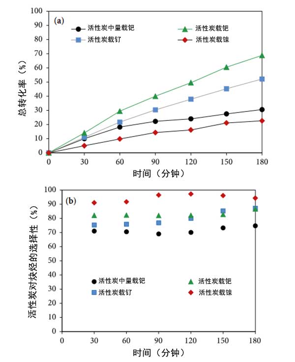 圖3:在120℃的氫中預處理的幾種活性炭催化劑的總轉(zhuǎn)化率(a)和炔烴(b)對時間的選擇性。