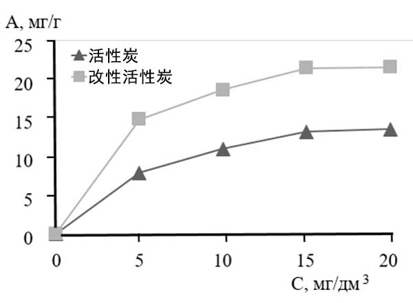 用發(fā)煙硫酸處理活性炭導致磺酸鹽基團捕獲吸附劑表面和孔內(nèi)部。用二氯乙烷對活性炭的初級處理有利于磺化劑在孔深度中的滲透,從而增強氧化,并由此促進磺酸鹽基團的形成?咨疃戎谢撬猁}基團的存在增加了吸附劑相對于汞離子的吸附能力。對于改性活性炭在靜態(tài)條件下對汞離子吸附的研究結(jié)果,根據(jù)獲得的實驗數(shù)據(jù),繪制了活性炭和改性活性炭的比較等溫線(圖1)。