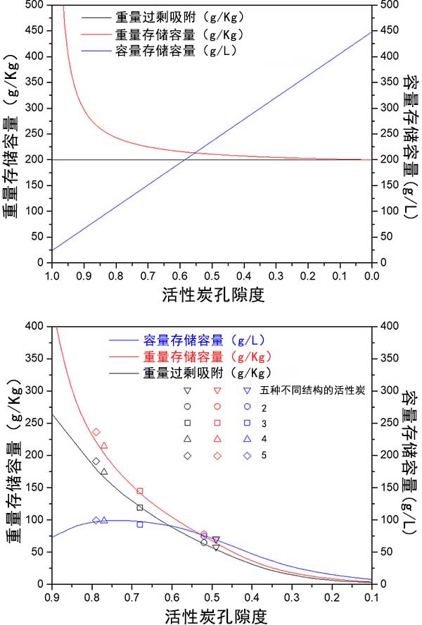 圖4顯示了兩種活性炭的重量和體積存儲容量之間的相互依賴性。實驗吸附測量與第二模型一致,將孔隙率和表面積作為因變量處理。經(jīng)過對比活性炭樣品的實驗性過量吸附,重量儲存容量和體積儲存容量。圖3和圖4將理論模型與實驗數(shù)據(jù)進(jìn)行比較。它表明,所開發(fā)的模型是通用的,并預(yù)測任何活性炭樣品的重量和體積儲存容量之間的相互依賴性。結(jié)果也適用于金屬有機(jī)骨架。雖然實驗結(jié)果比較好的活性炭不具有較高的表面積,但孔隙率在0.65和0.75之間。通過使用化學(xué)粘合劑將活性炭粉末壓縮成整料,實現(xiàn)了更高的體積儲存容量。整體的體積儲存容量使用整體式整體密度而不是活性炭的表觀密度或金屬有機(jī)框架材料的單晶密度來計算。