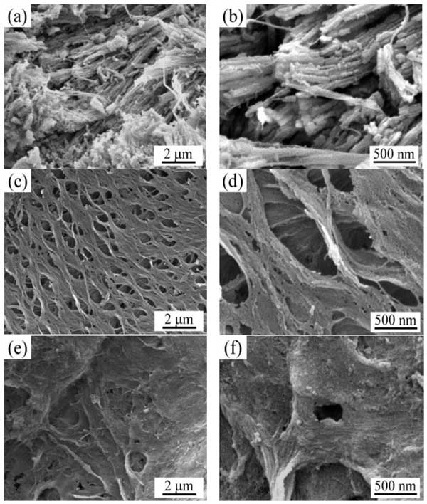 圖1:(a,b)原材料的SEM圖像(c,d)炭化原材料(e,f)活化后的活性炭。