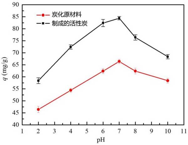 圖3:溶液pH值對(duì)柴油吸附到活性炭的影響。