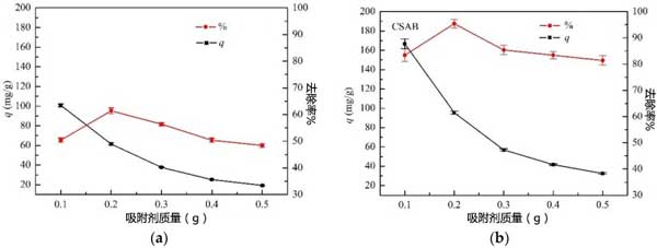 圖2:吸附劑用量對(duì)柴油吸附的影響:(a)炭化原料(b)活性炭。
