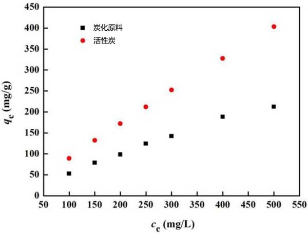 吸附等溫線:吸附等溫線對(duì)于描述溶質(zhì)如何與吸附劑相互作用非常重要,并且對(duì)于優(yōu)化吸附劑的使用至關(guān)重要。Langmuir等溫線假定單層吸附在含有均勻策略和吸附的有限數(shù)量的吸附位點(diǎn)的表面上,而在表面平面內(nèi)沒有吸附物的遷移。圖4顯示了柴油在所制備活性炭上的平衡吸附等溫線。從圖中可以看出,與炭化原料相比,活性炭的吸附等溫線更接近直線。隨著柴油溶液濃度的增加,活性炭對(duì)柴油溶液的吸附能力不斷增加。當(dāng)柴油濃度為500 mg/L時(shí),活性炭達(dá)到最大吸附量。然而,當(dāng)柴油溶液濃度達(dá)到400 mg/L時(shí),炭化原料的吸附容量增加緩慢?赡苁遣裼皖w粒覆蓋了材料的表面,導(dǎo)致吸附速率降低。從圖4中可以清楚地看出,活性炭的吸附能力明顯強(qiáng)于炭化原料。