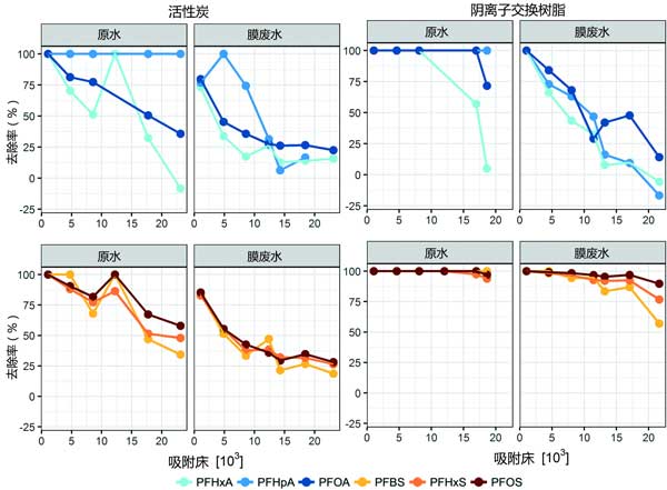 實驗總計進(jìn)行了12周,每兩周取樣。這導(dǎo)致所有活性炭色譜柱的實驗運(yùn)行時間為24個,分別處理原水和膜廢水的陰離子交換樹脂色譜柱。在每次采樣之后每周對所有柱進(jìn)行反洗,以模擬典型的全尺寸操作?偣卜治隽15種全氟烷基物質(zhì),將吸附材料相對于全氟烷基物質(zhì)去除的性能與柱吸附模型的性能進(jìn)行了比較。