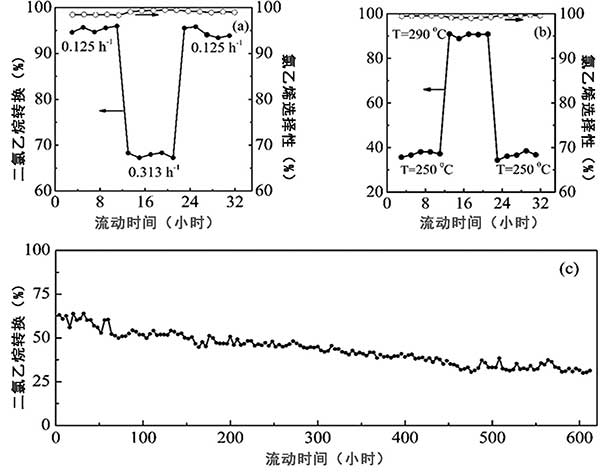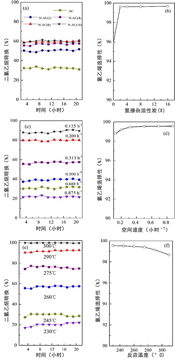 b、顯示出了反應(yīng)溫度對氮摻雜活性炭中的二氯乙烷液時空速穩(wěn)定性的影響。氯乙烯選擇性在所有情況下都是相對靜態(tài)的,高于99%。