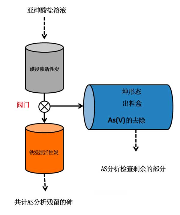 將5ml直徑為1.2cm的注射器裝入3cc的碘浸漬活性炭,以形成2.5cm長的填充柱。將棉濾器置于柱的末端,以避免活性炭的損失。使用設(shè)定為10ml/分的蠕動泵,將50mg/L砷溶液從頂部到底部連續(xù)地在柱中流動。溶液通過柱子,從底部噴嘴排出,并以150ml的份數(shù)收集,用于定期pH監(jiān)測。此外,在完成每次150ml的回收之后,從塑料小瓶中的噴嘴取出從柱中排出的下列1ml溶液用于砷化學(xué)分析。當(dāng)50mg/L砷溶液的氧化效率低于90%(意味著砷酸鹽濃度低于45mg/L)時,停止試驗。
