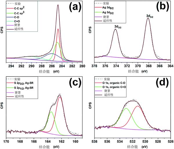 圖2顯示了所制備的活性炭樣品的組成元素的XPS光譜。XPS測(cè)量圖顯示碳,銀,硫和氧作為構(gòu)成元素的存在。S 1p光譜配有多個(gè)高斯分量,這些物種通常存在于活性炭表面上。圖2(b)分別顯示了多個(gè)峰,它們與零價(jià)態(tài)的銀原子一致。S 2p光譜的高分辨率光譜的反卷積,如圖2(c)所示,顯示兩個(gè)自旋軌道分裂為〜1.2 eV的峰。O 1s光譜顯示出不對(duì)稱的曲線,表明活性炭表面存在多種氧物質(zhì)(圖2d)。光譜的反卷積產(chǎn)生兩個(gè),其可分別歸因于活性炭表面的C-O和C O物質(zhì),因此不存在金屬氧化物物質(zhì)?傊,XPS結(jié)果表明硫醇鹽配體保持附著在銀簇表面的表面上,并且在活性炭樣品中不發(fā)生銀原子的氧化。