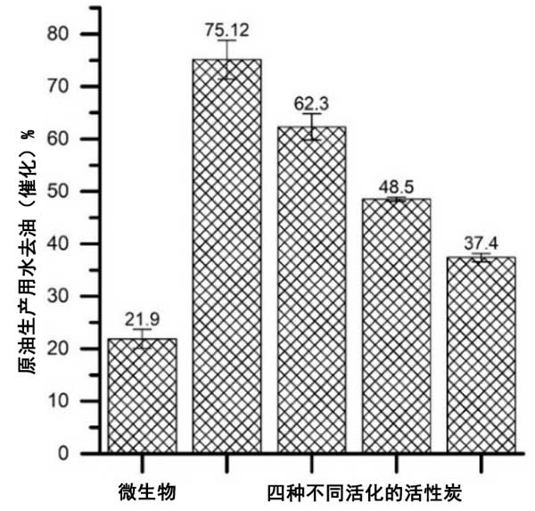 簡(jiǎn)而言之,使用活性炭(60%-93%)和載微生物活性炭(16%-84%)比游離的無(wú)活性炭載體的微生物(1%-47%)更好地去除芳香烴。材料的孔隙率和吸附偶極性有利于吸附。常規(guī)活性炭表現(xiàn)出高度的微孔性,其中可以容納分子量約為100的苯,甲苯和苯酚;钚蕴康姆菢O性特征保證了碳?xì)浠衔锏氖杷,也是非極性的;钚蕴筷(yáng)離子表面有利于芳烴保留,因?yàn)榉辑h(huán)中的π電子與表面陽(yáng)離子靜電連接。使用常規(guī)活性炭和載微生物活性炭的原油去除能力如圖3所示。使用游離的微生物和油-鹽水乳液作為對(duì)照。