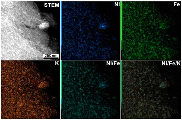 進行EDX映射以獲得有關顆粒的局部化學組成的更多信息。作為示例,圖2呈現(xiàn)了活性炭載鎳材料的EDX映射。如觀察到的圖2中,鎳和鐵,還鉀的存在下,在該材料檢測。這三種金屬的EDX映射的疊加顯示出完美的匹配,表明納米粒子結構中存在所有這些金屬。除小顆粒外,還觀察到一個位于碳末端的大顆粒,并且鎳比其他金屬富集。對于活性炭載銅和銦在顆粒結構中也發(fā)現(xiàn)了鉀的存在。