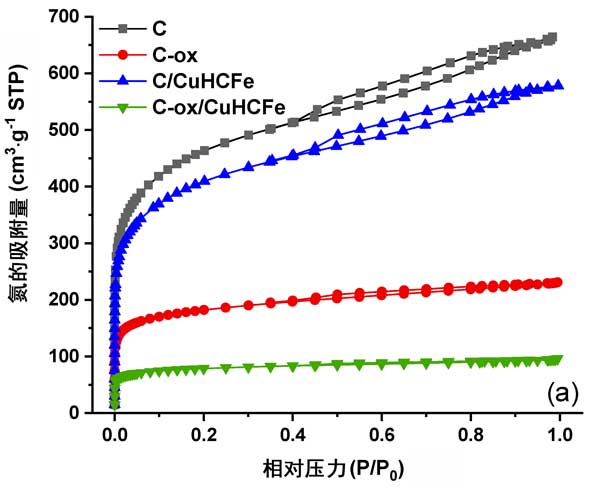 這些樣品的氮吸附等溫線和孔徑分布如圖3所示。。盡管活性炭和活性炭負載過渡金屬樣品的等溫線是I/IV型,結合了微孔和中孔性,但很難觀察到這些曲線的中孔部分,而活性炭負載過渡金屬樣品的等溫線幾乎消失了,說明了中孔性。該觀察結果與孔徑分布曲線一致,進一步顯示了孔徑和尺寸的減小。另外,我們注意到,在兩種情況下,過渡金屬銅相的引入均導致窄的孔徑分布。這可能表明活性炭孔中存在一些顆粒。多孔性的降低和氧官能團濃度的增加可能會影響銫的吸附性能。
