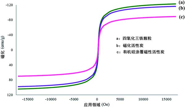 在這項研究中使用VSM來檢查合成活性炭的磁強度。對Fe 3 O 4顆粒,磁性活性炭和機硅涂覆磁性活性炭進(jìn)行了研究,以研究它們在涂覆時的磁強度趨勢。幾種材料的磁滯回線分別示于圖1(a)-(c)。根據(jù)獲得的結(jié)果。由于存在非磁性活性炭和有機硅表面活性劑涂層,磁強度似乎下降了。這確認(rèn)涂覆過程成功。但是,盡管在涂覆最終材料機硅涂覆磁性活性炭時磁化強度降低,但其磁強度仍在可接受的范圍內(nèi),并且強度足以在吸附過程中進(jìn)行。