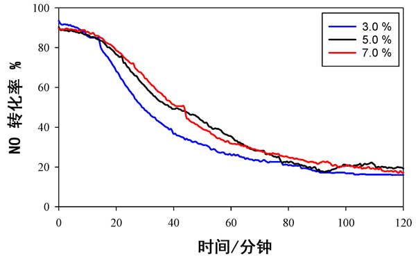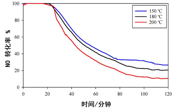 使用活性炭載錳氧化物催化劑時(shí),不同溫度下NO轉(zhuǎn)化率數(shù)據(jù)與時(shí)間的關(guān)系如圖2所示。它用于提供可以與以前發(fā)布的數(shù)據(jù)進(jìn)行比較的基線數(shù)據(jù)。在所有溫度(150°C,180°C和200°C)的前20分鐘內(nèi),幾乎有100%的NO轉(zhuǎn)化發(fā)生,但在此初始階段后NO轉(zhuǎn)化迅速下降,并且在2小時(shí)的測試后,轉(zhuǎn)化率不足20%;钚缘臏囟纫缽男砸来螢150°C>180°C>200°C。