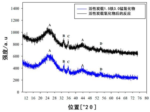 來自活性炭載鐵錳氧化物的XRD數(shù)據(jù)顯示在圖5中,其中已鑒定出主要峰。在2θ=24°和2θ=43°處的寬峰(標(biāo)記為A)與無定形碳的峰一致。它們的位置和寬度在新鮮和經(jīng)過測試的催化劑中都相同,這表明活性炭無定形結(jié)構(gòu)的穩(wěn)定性。在新鮮催化劑和測試催化劑中,在2θ=33.5°,2θ=35.1°和2θ=54.3°處分別出現(xiàn)了另外三個(gè)峰(分別標(biāo)記為B,C和D),并且位置或峰強(qiáng)度沒有明顯變化作為反應(yīng)測試的結(jié)果。2θ=33.5°(峰標(biāo)記為B)處的峰歸因于Fe 2 O 3 和在2θ=35.1°和54.3°的峰歸因于Fe 3 Mn 3 O 8,盡管在新鮮和測試的催化劑中這些與鐵有關(guān)的峰的強(qiáng)度和寬度相同,但是由于XRD峰較弱,因此很難確定在測試過程中鐵和錳的結(jié)晶度是否發(fā)生了變化。然而,結(jié)合的鐵氧化物與錳氧化物確實(shí)原因形成Fe 3的Mn 3 ö 8固體溶液,其可在的活性炭載鐵錳氧化物催化劑的NO轉(zhuǎn)化。