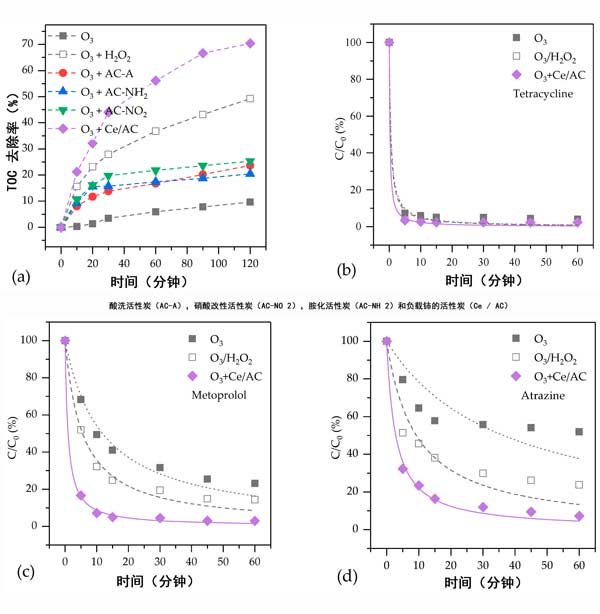 四種活性炭催化劑,例如酸洗活性炭,硝酸改性活性炭,胺化活性炭和通過改性和浸漬制備的載鈰活性炭。硝化和胺化分別提高了表面酸和堿性官能團(tuán)的濃度,可以在一定程度上提高活性炭的活性。由于吸附,臭氧化和自由基氧化,在活性炭上負(fù)載鈰可以顯著增強(qiáng)活性炭催化臭氧化過程中水中有機(jī)化合物的去除。載鈰活性炭在水中對(duì)反滲透濃縮液催化臭氧氧化和有機(jī)化合物礦化方面非;钴S。它可以極大地刺激·OH的生成,這對(duì)于去除水中的難降解有機(jī)化合物起著重要作用;钚蕴勘砻娴墓倌軋F(tuán)有助于生成·OH。此外,Ce 3+的氧化還原循環(huán)的組合Ce 4+和富電子結(jié)構(gòu)與氧化鈰之間的電子轉(zhuǎn)移對(duì)于在載鈰活性炭表面快速連續(xù)地生成·OH非常有效。由于這些優(yōu)點(diǎn),載鈰活性炭是催化臭氧化的有前途的催化劑。