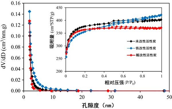表面積和孔徑?jīng)Q定了吸附劑的吸附性能;钚蕴烤哂写罅康膬(nèi)部孔,具有較大的比表面積。HNO 3和Fe 對改性活性炭的BET表面積,BJH平均孔徑和孔體積均有不同程度的變化。在常溫條件下,濃HNO 3在活性炭表面溶解了一定的灰分,有助于進(jìn)一步擴(kuò)大多孔結(jié)構(gòu)。但是,濃HNO 3還腐蝕了活性炭的結(jié)構(gòu),從而部分破壞了內(nèi)部通道結(jié)構(gòu)并降低了活性炭的比表面積。至于鐵改性的活性炭,內(nèi)表面的鐵材料層堵塞了某些通道,從而降低了比表面積,平均孔徑和孔體積。