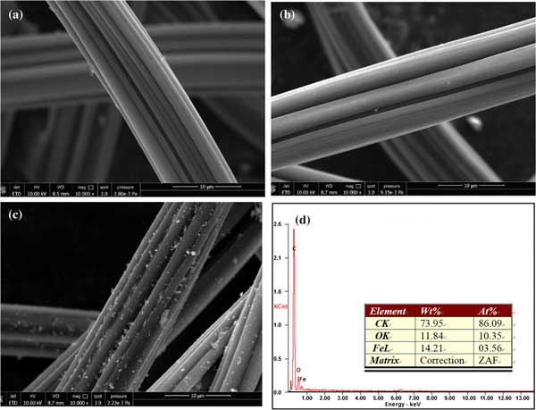 圖2示出了原始活性炭纖維的SEM圖像,并將其顯示,活性炭的表面有凹槽和平滑的整體,其中有幾個裂縫和小斑點(diǎn)(圖2的B)。HNO的表面形貌和鐵改性活性炭變?yōu)榇植?圖2c)和表面覆蓋由絮狀直徑在約數(shù)百納米的。如圖2d所示,EDX分析表明主要元素為C,O和Fe。觀察到在活性炭表面上載有一層約20-80nm的鐵納米顆粒。