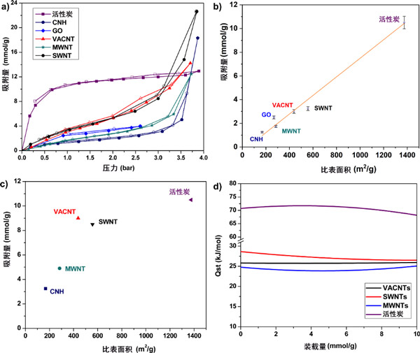 圖1顯示了不同吸附劑的示意圖。活性炭具有無(wú)序的孔結(jié)構(gòu)(圖1a),其孔隙度是由基本結(jié)構(gòu)單元的無(wú)規(guī)堆積引起的,該結(jié)構(gòu)單元可能是小于10-20環(huán)的平面芳族結(jié)構(gòu),分布在2-4層上或有缺陷的微石墨烯層。具有這種形態(tài),它代表具有擴(kuò)展的結(jié)構(gòu)紊亂的類型學(xué)碳吸附劑。氧化石墨烯具有2D分層結(jié)構(gòu),如圖1b所示。合成氧化石墨烯的起始材料是石墨,石墨的氧化引入了氧官能團(tuán),繼而增加了層間距并使材料變成親水性。隨后的剝落步驟將各層分開,從而顯著增加其可訪問的表面積,從而導(dǎo)致單層或少層氧化石墨烯的形成。在我們以前的工作中,通過XPS分析,我們發(fā)現(xiàn)氧化石墨烯上存在的氧官能團(tuán)是羥基和羧基的形式。材料在孔隙率和功能化程度方面的可調(diào)性使氧化石墨烯成為親水性碳吸附劑的原型,因此對(duì)于研究2D材料中的氣體吸附也很有趣。碳納米角具有管狀結(jié)構(gòu),在一端具有封閉的錐形尖端結(jié)構(gòu)(圖1c)。單個(gè)碳納米角通常為單壁,內(nèi)徑為2-4 nm。碳納米角的獨(dú)特特征是直徑為50–100 nm的剛性球形聚集結(jié)構(gòu)。合成后的碳納米角關(guān)閉,氣體分子無(wú)法進(jìn)入碳納米角內(nèi)部。氧化處理,例如在空氣中加熱,O 2 或CO 2用于打開碳納米角,從而將可及表面積增加3-4倍。碳納米角具有微孔的組合,對(duì)于氣體吸附應(yīng)用很有趣,因?yàn)樗鼈兛梢源罅可a(chǎn)且純度高。