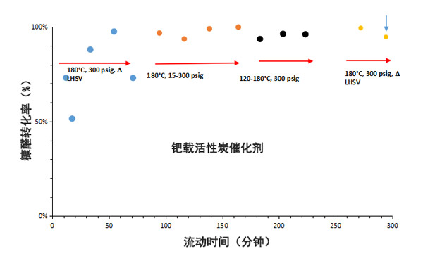 圖1:使用活性炭催化劑進行糠醛加氫的生產(chǎn)時間分析,箭頭表示將乙酸添加到進料中的實驗。