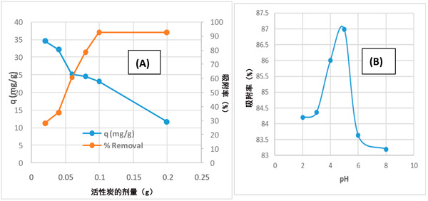 我們研究了不同參數(shù)對活性炭去除乙酰胺的影響,例如吸附劑的劑量,pH,乙酰胺的初始濃度和接觸時間。吸附劑的用量是吸附過程中的重要參數(shù),因為它決定了系統(tǒng)中吸附劑與被吸附物的平衡以及給定濃度下吸附劑的容量。吸附劑劑量對由活性炭去除啶蟲脒的效果在不同的吸附劑的劑量從0.02-0.2克/100毫升變化進行了研究,如圖1。隨著活性炭吸附劑劑量的增加,對乙酰胺的去除百分率從27.8%增加到92.5%。這可以歸因于活動站點數(shù)量的增加。在較高的吸附劑量下,由于聚集體的形成,吸附位點的使用不完全。與去除百分率相反,隨著吸附劑劑量的增加,活性炭對乙酰胺的吸附能力下降了一些。注意到在0.1g的吸附劑劑量之后,吸附效率沒有顯示出顯著的增加,這表明了吸附位點的飽和。對于通過活性炭去除乙酰胺實驗而言,0.1 g的吸附劑量似乎是合適的。