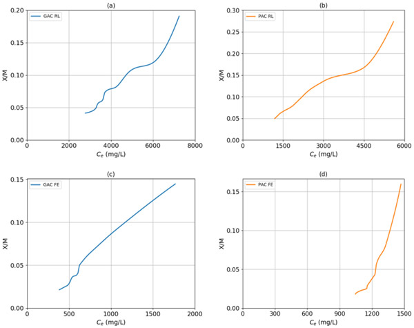 圖1顯示了顆粒活性炭與原浸出液,粉狀活性炭與原浸出液,粉狀活性炭與廢液以及粉狀活性炭與廢液的實(shí)驗(yàn)等溫線。兩個(gè)樣品的曲線和兩個(gè)活性炭對(duì)應(yīng)于S形的等溫線(II型)的行為,因?yàn)榍是凹向上,所以多層吸附進(jìn)行活性炭的表面上。利用該信息,就滲濾液而言,不管活性炭顆粒的性質(zhì)和大小如何,都可以假定吸附劑中殘留的化學(xué)需氧量是通過物理吸附發(fā)生的。