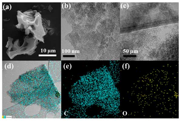 圖1:活性炭的SEM圖像(a),TEM圖像(b,c),孔隙數(shù)據(jù)(d)和元素映射(e,f)。